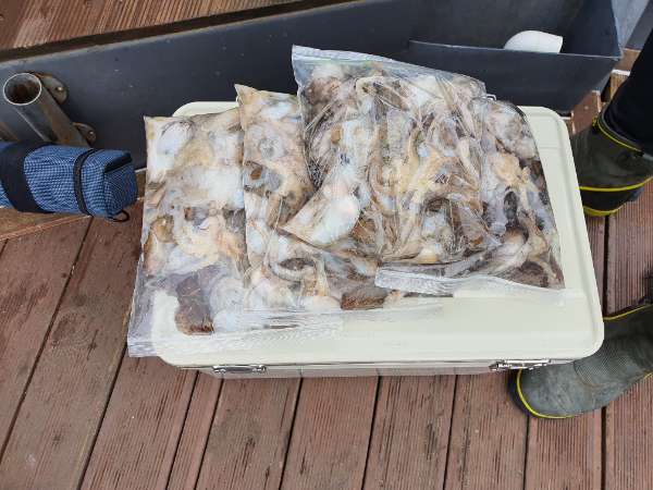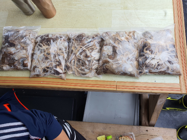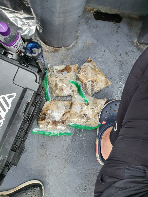 출항하믄서 부터 비가 오락가락 왔구유 첫포인트는 마릿수가 만족스럽지 못해서 ㅠㅠ 포인트 이동 몇차례 했네유 그래서 거의 하루의 대부분을 DEEP에서 ~~~~~~ 한마리 한마리 뽑아냈네유 ^^ 쭈도 잡고, 운동도 하고 1석 2조~~~ 도랑치고 가재잡고~~~~ . . . 는 아니구유. 사이즈 마릿수 보려니 어쩔수가 읍었네유 ㅠㅠ 오늘 장원은 180마리 오버 평균 100 ~ 150마리 못잡으신 분은 30마리도 있네유 ~~^^